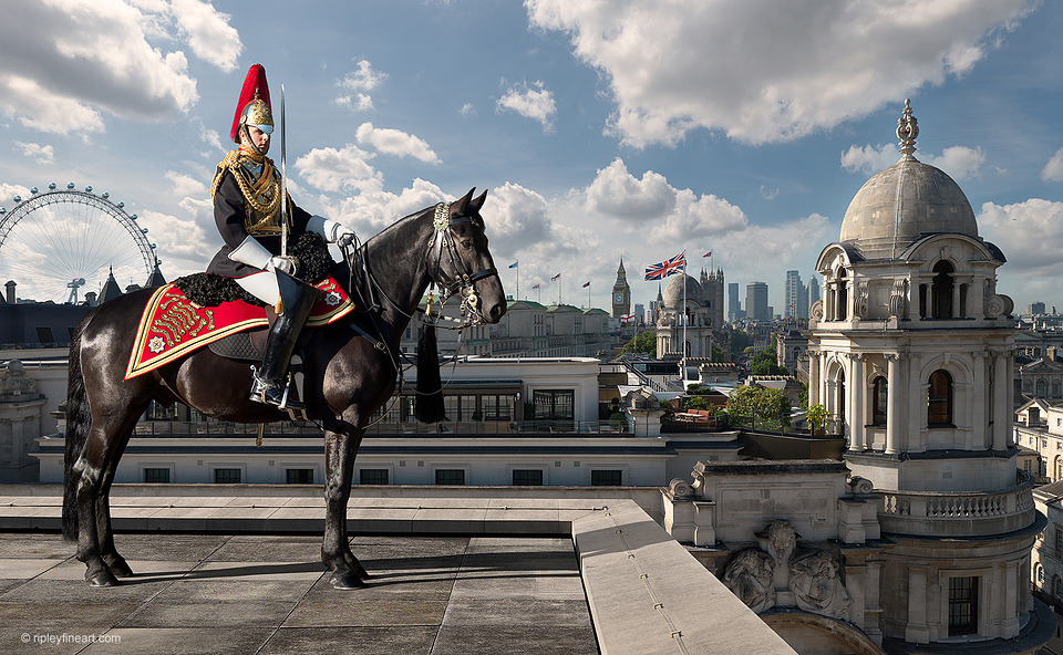 The pictures, which took several years to create, portray officers and soldiers from The Life Guards and The Blues and Royals mounted on their horses and posed on buildings throughout London.